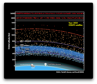 El veterano Hubble y el recién llegado SPHEREx —lanzado en este 2025— son dos de los telescopios espaciales que la NASA tiene en la órbita terrestre baja, la zona del espacio poblada actualmente por más de 9.000 satélites Starlink de Elon Musk, la mayoría girando a unos 550 kilómetros sobre la superficie de la Tierra. La nueva investigación predice que, con 560.000 satélites desplegados en órbita, casi el 40% de las imágenes del Hubble contendrá al menos una traza de un satélite; en el caso de SPHEREx quedarían contaminadas hasta el 99% de las astrofotografías.