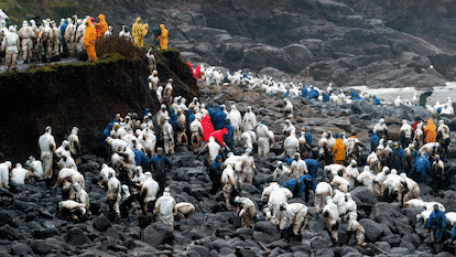 El 13 de noviembre de 2002 el buque Prestige empezó a derramar hidrocarburos a unos 30 kilómetros del cabo Finisterre. El 19 de noviembre, cuando estaba siendo remolcado para alejarlo de la costa, se partió en dos y se hundió a unos 260 kilómetros al oeste de Vigo. Se vertieron unas 63.200 toneladas de hidrocarburos, que mancharon las costas de Galicia y de gran parte del Cantábrico, llegando hasta Francia y Portugal. En el barco quedaron otras 13.700 toneladas, que España extrajo en 2004. Los trabajos para limpiar el mar y toda la costa se prolongaron durante años, aunque en la actualidad se encuentran recuperados en su mayor parte. Las fotos de voluntarios quitando chapapote enfundados en trajes blancos siguen siendo icónicas.