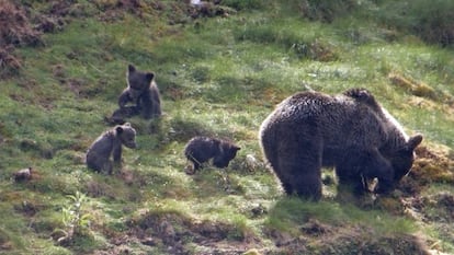 Andrea Kieser, alemana de 55 años, escudriña las escarpadas montañas de Somiedo con unos prismáticos. “Hemos visto ya un gato montés, un rebeco... Pero nos encantaría ver un oso. Creo que vamos a tener suerte”, dice. No se equivoca. “¡Allí hay uno!”, señala el guía. Un prolongado “¡ohhhh!” escapa de las gargantas de los 10 turistas alemanes, que giran sus telescopios hacia la zona donde aparece Clarita, una osa que camina confiada entre riscos, y se quedan mirando hasta que se vuelve a esconder. El turismo es la cara más amable de la recuperación de los plantígrados en la cordillera Cantábrica, cuya población ha pasado de unos 60 o 70 ejemplares a más de 370 en cuatro décadas. El riesgo, ahora, es que algunos animales se acerquen a los pueblos y se habitúen a los humanos, causando incidentes. Para evitarlo, Asturias ha puesto en marcha un programa para controlar a los osos que denomina problemáticos, que incluye trampas, collares con GPS, contenedores blindados y balas de caucho.