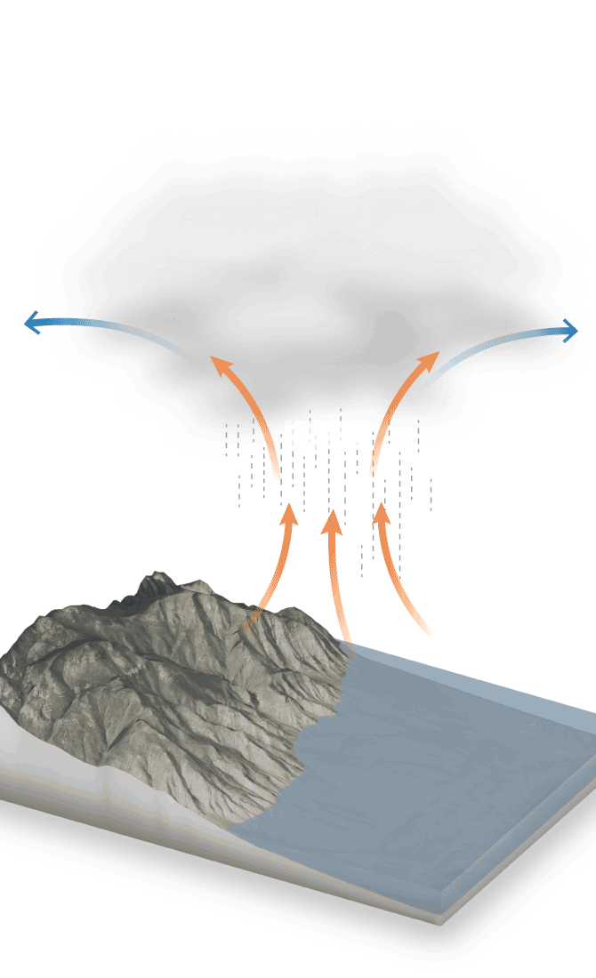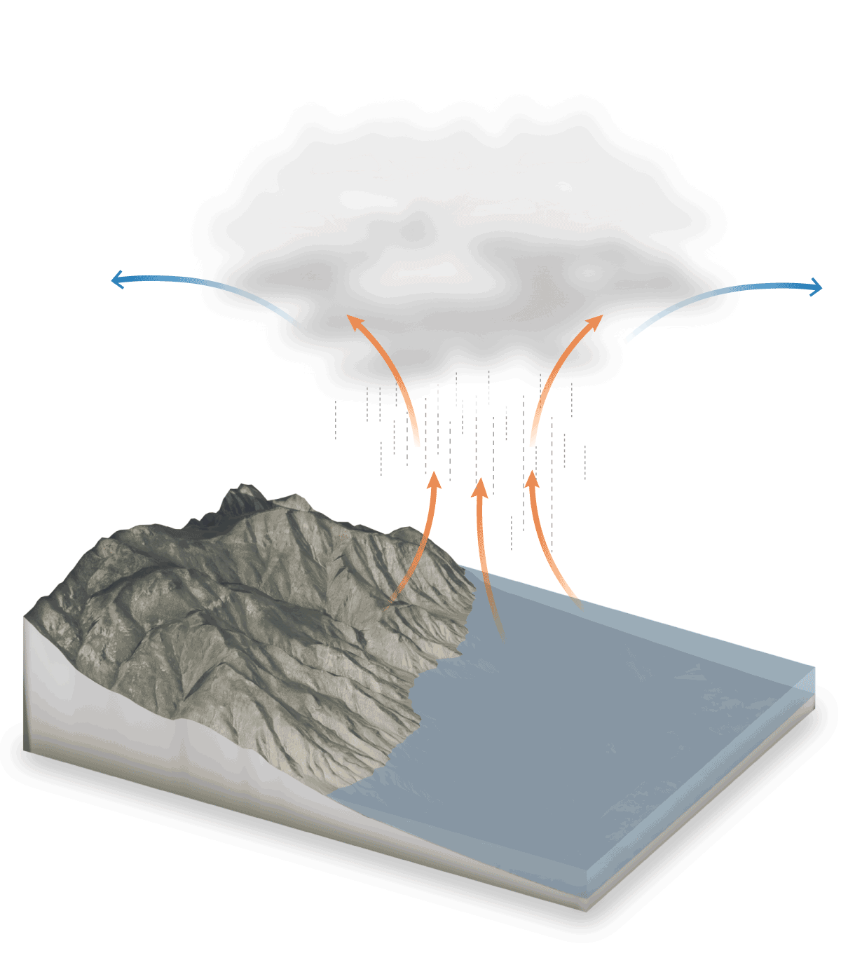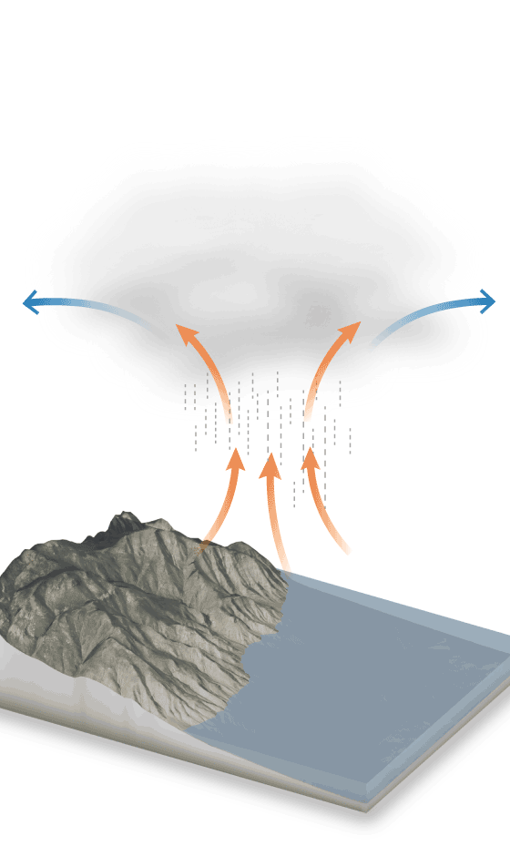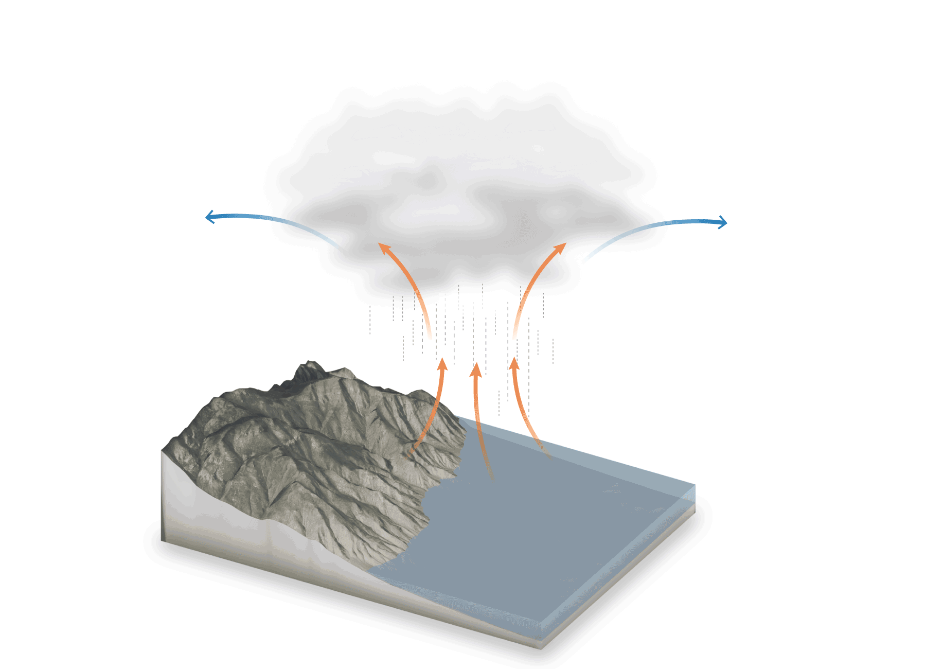 En una borrasca, el aire cálido asciende en el centro de la baja presión, se enfría, se condensa y forma nubes cargadas de agua