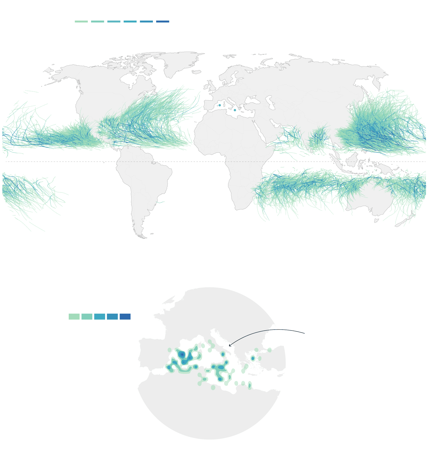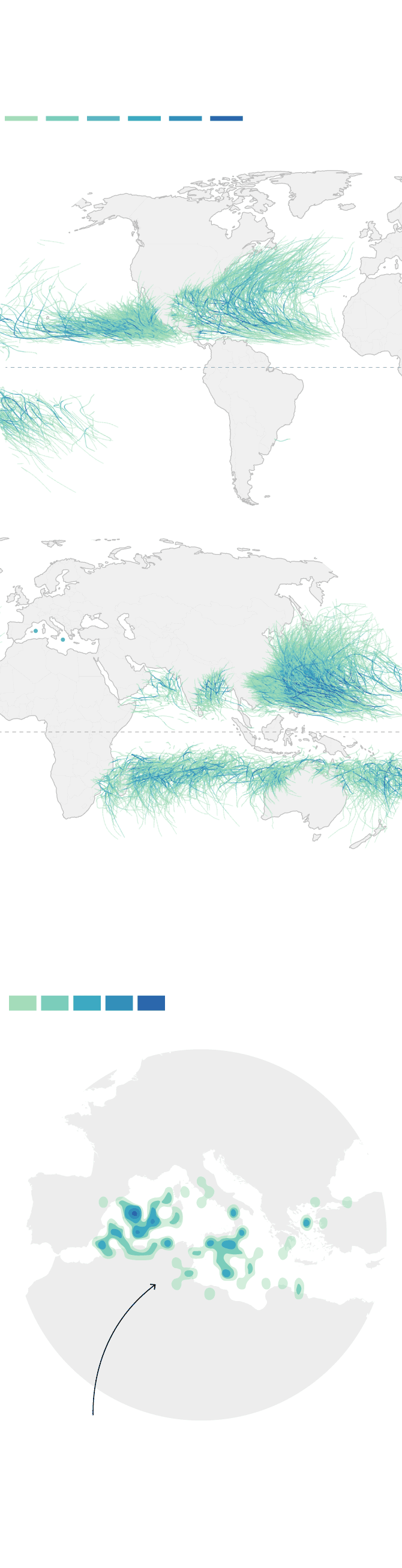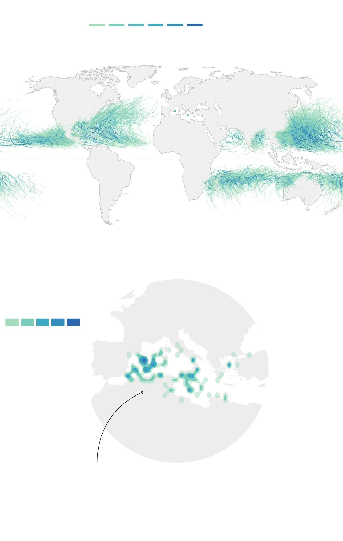 Dos zonas donde se forma el mayor número de medicanes: en el Mediterráneo occidental y en el Mar Jónico.