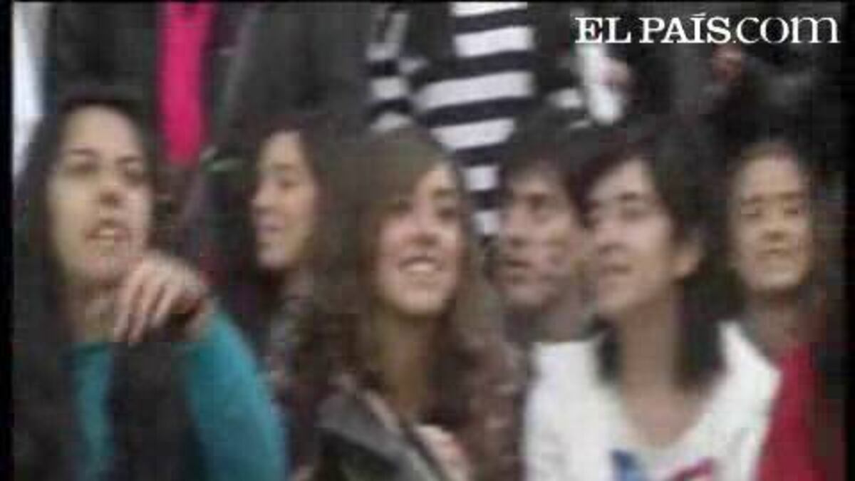 De hecho, si alguien hubiera cerrado los ojos en la plaza de Felipe II a las cinco de la tarde, no hubiera sabido si estaba en un parque de atracciones o en la plaza de la Liberación en El Cairo. Entre las hipofíticas estampidas al parking porque pasaba un coche que a lo mejor transportaba al chavalín de oro, los gritos de guerra ("¡Jus-tin, Bie-ber!"), el impresionante despliegue de merchandising (camisetas, pulseras, deportivas, sudaderas, linternas...), los ocho desmayos que tuvo que atender el SAMUR y las caras pintadas de corazones, las miles de chicas que aguardaban al concierto parecían una masa uniforme y beligerante. "Es el día con el que voy a soñar toda mi vida, por Dios, el día que vi a Justin en persona", gimoteaba Adela, cacereña de 15 años. "No sé si podré tomar suficientes fotos".