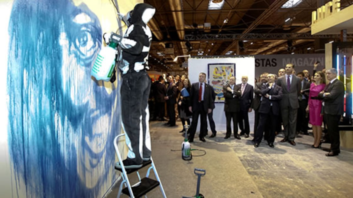 La feria de arte contemporáneo Arco 2012 ha recibido hoy la visita inaugural de los príncipes de Asturias, don Felipe de Borbón y doña Letizia Ortiz, que han abierto su recorrido deteniéndose en obras del artista catalán Antoni Tàpies, fallecido recientemente. También han recalado en el stand de EL PAÍS, donde han saludado al director del periódico, Javier Moreno, y al presidente ejecutivo de la división de prensa del Grupo PRISA y consejero delegado de EL PAÍS, José Luis Sainz. Allí han contemplado cómo el artista Suso33 ejecutaba en vivo una de sus obras de arte urbano: un rostro de gran formato sobre una pared blanca.