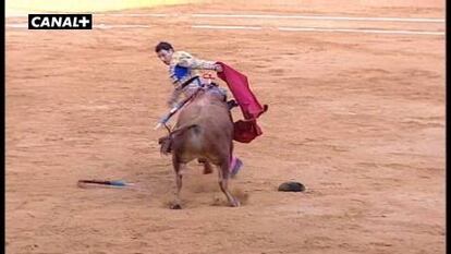 Pascual Javier. Pinchazo –aviso- y más de media tendida (saludos); pinchazo, entera y descabello –aviso- (silencio).