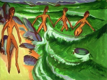 Pero la obra que Kirchner realizó a lo largo de 35 años de incesante trabajo no se limita a su etapa expresionista[PUENTE]. Y ahora, su auténtica dimensión como artífice de la modernidad del siglo XX se muestra por primera vez en España en la exposición antológica que, hasta el 2 de septiembre, se puede visitar en la Fundación Mapfre. Nada menos que 153 obras, entre óleos, papeles y esculturas prestadas por 26 museos (el Kirchner Museum de Davos es el más generoso en el préstamo) y numerosas colecciones privadas. De manera paralela, una selección de 35 fotografías muestra las escenas reales a partir de las cuales desarrollaba su obra.