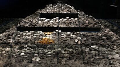 Entre las casi 200 piezas (procedentes de 27 colecciones, incluida la National Portrait Gallery) que se reparten entre ambas sedes hay más de un tesoro: un cuadro enciclopédico del Museo de Ciencias Naturales sobre la fauna americana (1799), una reproducción de la Mercedes construida por los carpinteros del Museo Naval siguiendo los modelos navales del siglo XVIII, una colección anónima de dibujos con el relato de la batalla y, claro, parte del tesoro: 30.000 monedas de plata que forman un zigurat reluciente agrandado con espejos. A Carmen Marcos, comisaria de la muestra en el Arqueológico y experta en numismática, se le ensancha la sonrisa. Está entre sus criaturas. Las encontró en Florida, apelmazadas y corroídas. Ella mejor que nadie sabe su valor: “Hicieron mover la economía de la Edad Moderna”. En una vitrina se muestran pesos españoles de plata resellados con la efigie de Jorge III para que circulasen legalmente en Inglaterra. “Eran el dólar de la época”.