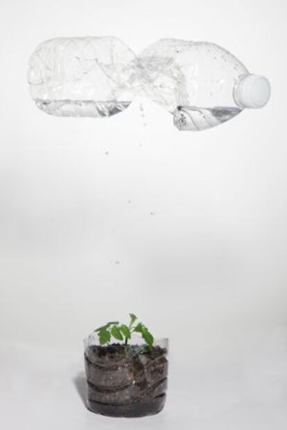 Reducir, reciclar y reutilizar son los componentes de la regla de las tres erres, también conocida como regla del medio ambiente. Carolina Fernández, ganadora del segundo concurso fotográfico sobre reciclaje, Upcycling, convocado por las organizaciones de medio ambiente Ecoembes, Ecoalf y la Escuela de Fotografía Centro de Imagén EFTI, se basó en esta enunciación para crear su foto 3R. En la imagen se ven dos botellas de plástico, una partida por la mitad que sirve como maceta para una pequeña planta y otra encima de esta con un agujero del que caen unas gotas de agua. Desde ayer se pueden ver en la sede de EFTI en Madrid 36 de las obras finalistas del concurso al que se presentaron 240 trabajos y que está dirigido principalmente a quienes empiezan en la fotografía.