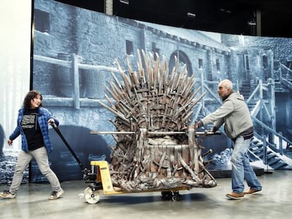 Así hasta que el viernes pasado aterrizaron en el aeropuerto de Barajas las 75 enormes cajas de madera, todas con el sello de la serie y numeradas. Tres tráilers de 13 metros y un cuarto camión adicional se encargaron de trasladar las cajas a Matadero. “Empezamos a descargar a las 5.30 de la mañana y en unas tres horas ya estaba todo dentro de la nave. Después, dos personas de HBO, los tour managers, organizan el montaje”, explica Raúl de Lamo, encargado de la producción de la exposición, mientras sigue atendiendo incansable las dudas y solicitudes del personal que trabaja preparando la muestra. Lo último que se montará hoy será toda la parte técnica y la experiencia virtual en 4D. Y tras el domingo, llegará el desmontaje, que tendrá lugar a toda velocidad para que las 75 cajas viajen hasta Berlín, esta vez por carretera.