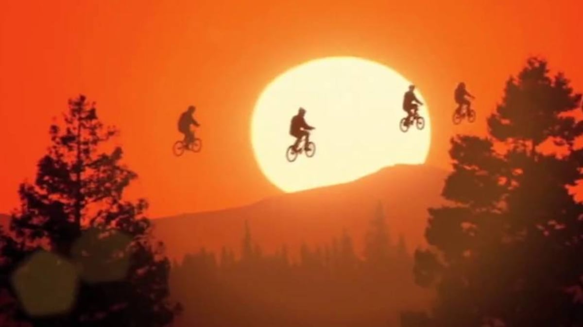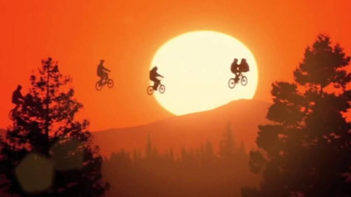 E. T., el extraterrestre (1982). Si te cansas de pedalear, tu amigo del espacio exterior puede hacer que tu bicicleta vuele y ofrezca una hermosa silueta con la luna de fondo. Al menos a Elliott le funcionó.