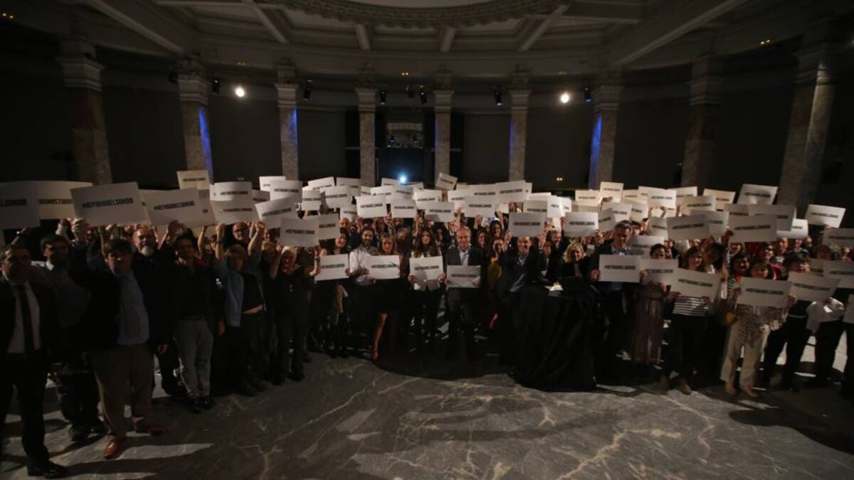 El equipo directivo de EL PAÍS también se fotografió con el cartel que llevaba escrita la etiqueta para dar visibilidad a la campaña. Antonio Caño, director del diario, recalcó que este periódico actúa como plataforma para que la campaña llegue al público. “Queremos dar a conocer una de las mayores tragedias de Europa. Debe remover conciencias”, enfatizó Caño, para quien este es “el gran problema de Europa, que puede no sobrevivir a este conflicto. Los Gobiernos europeos han cometido una gran injusticia”.
