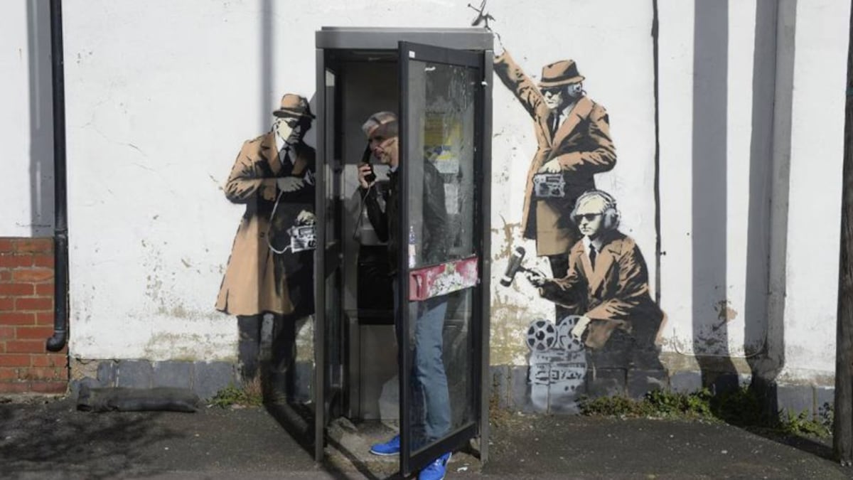 Spy Booth (La cabina espía) el título de esa obra de arte urbano plasmada en una pared de un inmueble de la localidad de Cheltenham (unos 110.000 habitantes) por el grafitero más célebre del mundo, fue objeto de controversia desde que apareciera una mañana de abril de 2014 junto a un edifico georgiano del siglo XIX y catalogado. Los ciudadanos emprendieron una campaña para conseguir la protección oficial de una pintura ejecutada a golpe de spray, que desde entonces atrajo a muchos turistas y curiosos, convirtiendo el inmueble en uno de los más fotografiados del país. Sin embargo, el mural también fue víctima de reiterados actos de vandalismo que intentaron tapar la siniestra imagen que retrataba: un grupo de espías, ataviados a la manera de las películas los años cincuenta (gafas de sol, gabardinas...) y equipados con todo tipo de aparatos de vigilancia, pinchando la llamada del usuario de una cabina telefónica real.