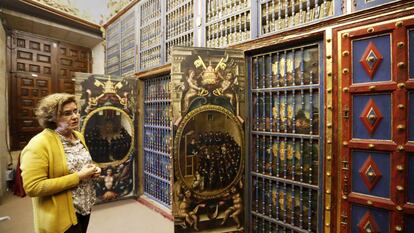 La fachada de la Universidad de Salamanca se añadió décadas después al edificio construido en el siglo XV. Ese espacio entre portada y construcción alberga otra joya del conjunto, la sala de los manuscritos, entre ellos, un libro de horas, del siglo XI, elaborado para la reina leonesa Sancha. La universidad posee 3.000 manuscritos, 487 incunables y 60.000 volúmenes fechados entre 1501 y 1830, dice la directora de la biblioteca, Margarita Becedas. Algunos manuscritos descansan en armarios cuyas puertas están decoradas en su interior con pinturas irónicas, que retratan cómo eran las clases en el XVII: alumnos que no atendían y se pasaban notas.