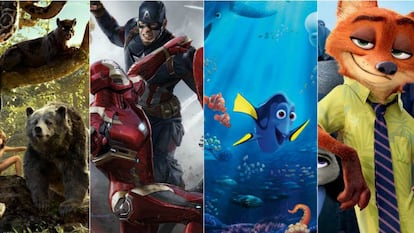 Pero las cifras del gigante fundado en 1923 no dejan respirar a la competencia. Disney habrá logrado al finalizar el ejercicio el número uno en la taquilla estadounidense en 21 de las 53 semanas del año. Una marca que le lleva a copar más de un 25% del mercado. O lo que es lo mismo, Disney obtendrá un cuarto de todo lo recaudado este año en EE UU, según los datos de la web especializada Box Office Mojo. Su inédito éxito se basa en cinco patas: el choque de los héroes Marvel en Capitán América: Civil War; la secuela de uno de los grandes éxitos de Pixar, Buscando a Dory; los animales parlantes de Zootrópolis; un remake de uno de sus grandes clásicos, El libro de la selva y la nueva entrega de la saga galáctica de Lucasfilm, que sigue escalando posiciones. Las tres primeras son las únicas cintas del año en superar los mil millones.