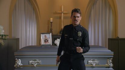 Como en las grandes comedias negras, todo es cómico y trágico al mismo tiempo, y no sucesivamente, hasta alcanzar con ello la frontera de lo patético. La compleja existencia del policía, que ha perdido a su madre y vive un difícil proceso de divorcio, es narrada por su autor utilizando como símbolo vital la canción de Bruce Springsteen que da título a la película. Y, sin embargo, Thunder Road, “esta noche seremos libres…”, que es básica en el devenir de la historia y que funciona casi como mcguffin, impulsando el relato y moviendo a los personajes, nunca llega a sonar de fondo. Un problema con los derechos, surgido ya con el corto original, induce a Cummings a una genialidad.