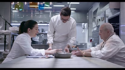Como queda claro en cada palabra, Elena adora a su padre, pero también en cada frase se atisba que ha luchado por ser Elena Arzak, no Elena la hija de. “Cuando comencé la hostelería, tuve la absoluta libertad de dejarlo cuando quisiera. Tengo dos hijos, y yo nunca les voy a obligar a trabajar en esto. En mi caso, empecé a estudiar en Suiza en 1988 y al año siguiente mi padre me llamó para anunciarme que le daban las tres estrellas Michelin. Y dijo: ‘No sé cuánto vamos a durar con ellas’. Y ahí están, y es un orgullo”, reflexiona. Y va más lejos, con voz firme bajo su mascarilla. “En lo personal, sabía que iba a ser muy difícil. Mis padres me subrayaron que trabajara duro, que eso haría olvidar a la gente sus prejuicios. Esta película es por eso importante para mí. No estoy ahí por casualidad. Con todo, me ha gustado estar al lado de mi padre, y aún me gusta estar con él. Los días que vengan con él serán un regalo. Aunque no es lo mismo que tu jefe sea tu padre o que sea solo tu jefe”.