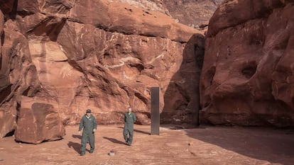 Así, con humor, y alegando que no había denuncias de propiedad sustraída ni de otros delitos, la oficina del sheriff renunciaba a investigar el caso del misterioso monolito de metal que acaparó la atención del mundo tras ser descubierto en una remota localización de un desierto de Utah. Una rebanada lisa de metal plateado de unos tres metros de altura, como salida de una novela de Philip K. Dick, erguida en la tierra rojiza entre cañones. El objeto fue descubierto el 18 de noviembre, de manera casual, por una patrulla aérea que contaba cabezas de borregos cimarrones en la zona. Su presencia en ese pedazo de tierra pública fue tan mediática como efímera. El pasado viernes por la noche, 10 días después del hallazgo, cuatro hombres sin identificar arrancaron la pieza y se la llevaron. El objeto, tal como llegó, se fue. Las preguntas permanecen.