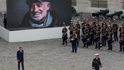 A los familiares, amigos y compañeros de pantalla que quisieron darle un último adiós público no les cabía ninguna duda: Jean-Paul Belmondo habría esbozado una vez más esa gran sonrisa que inmortalizó en tantas de sus películas si hubiera podido ver el gran homenaje nacional que le brindó su país este jueves en Los Inválidos de París. La ceremonia, solemne y un tanto festiva a la vez, estuvo presidida por el jefe de Estado francés, Emmanuel Macron, quien tras conocer la muerte del actor galo, este lunes a los 88 años, no dudó en calificarlo de “tesoro nacional” merecedor de unos honores de Estado reservados a muy pocas personalidades de Francia.