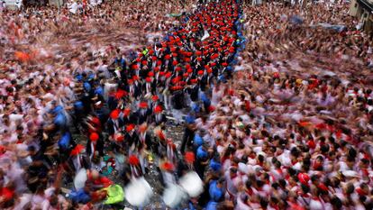 Como en cualquier acontecimiento masivo, una parte de las fiestas de San Fermín solo puede apreciarse bien en la pantalla. El exfutbolista Juan Carlos Unzué, enfermo de Esclerosis Lateral Amiotrófica (ELA), emocionó sin duda a muchísimos telespectadores cuando, antes de encender la mecha del chupinazo, dedicó estos sanfermines al personal sanitario y a quienes sufren su misma enfermedad. A pie de plaza apenas se le pudo ver o escuchar. Entre el ruido, la orgullosa exhibición de pañuelos rojos, los gritos a favor de San Fermín ―no tanto el santo como la fiesta―, la aspersión generalizada de líquidos como el calimocho o la sangría y los abrazos a propios y extraños, había que conformarse con oír el petardazo.