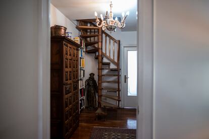Ha costado. Elisa Delibes, de 72 años, pasea por el inmueble, que conecta con el piso donde ella reside mediante unas escaleras de caracol, de madera, que el patriarca subía y bajaba a diario antes de morir. A la izquierda, un amplio salón con un enorme cuadro de su padre de John Ulbricht y miles de libros, propios y ajenos, meticulosamente repartidos entre estanterías que él mismo, poco amigo de adornos y decoraciones, mandaba colocar cuidadosamente. Aquí, el Premio Cervantes; allá, el Premio Príncipe de Asturias; al fondo, la butaca en la que recibía a los ganadores del Premio de Periodismo Miguel Delibes, a cuyas galas evitaba acudir porque, como sonríe su hija, “no era muy sociable”. A cambio, organizaba tertulias caseras: “Era entretenido y divertido, pero no le gustaban las grandes reuniones. Siempre decía que Ángeles se movía por ellas como una mariposa y a él le tocaban los pelmazos”.