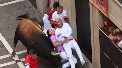 El drama acaeció en el primer tramo de la larga calle de Estafeta. Ya unos metros antes de llegar a los tablones de la curva en la que finaliza Mercaderes, un joven con camiseta roja se introdujo en la manada, pegado a la madera y rodeado de pitones, y se libró de milagro de lo que parecía una segura cornada. Tuvo la fortuna de encontrar un hueco, huir de la emboscada, buscar con ansiedad una zona de tranquilidad y respirar profundamente tras el mal trago.