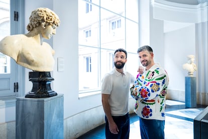 La historia de amor entre Bernardo Pajares y Juanra Sanz, dos trabajadores del museo madrileño, se gestó rodeada de los miles de obras que alberga el edificio, entre ellas las dos que recuerdan a Adriano y Antínoo. Su unión y su pasión común dio como fruto el podcast Arte compacto, un rincón que aplica nuevas perspectivas a la Historia del Arte. Esta bitácora sonora combina su intimidad de pareja con un diario de viajes y con la historia detrás de las grandes obras de la pintura, la escultura o la fotografía. Su primer libro común, Pasiones creativas (Aguilar), mantiene esa esencia y aborda 10 episodios de amor, pasión y deseo que han dado significado a grandes obras. “Nosotros reaccionamos al arte como lo hace todo el mundo, desde aquello que te apela, desde tus recuerdos y experiencias”, comenta la pareja en el Museo del Prado. El texto se centra en un aspecto que les atrae irremediablemente: las intimidades, en cualquiera de sus formas, que dan pie a la creación de una pieza artística.