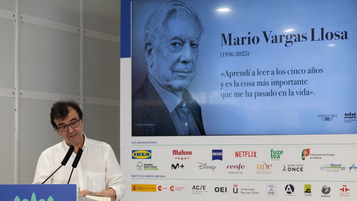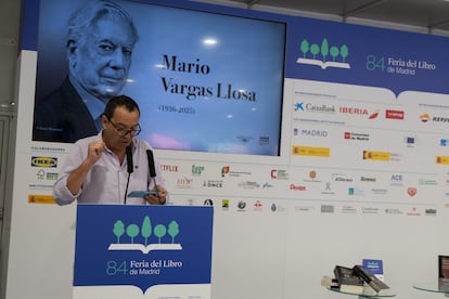 “Aprendí a leer a los cinco años y es la cosa más importante que me ha pasado en la vida”, decía una cita en la pantalla, al lado de la efigie de Mario Vargas Llosa. Ha sido la presencia que ha presidido el homenaje de la Feria del Libro de Madrid, este sábado, al premio Nobel hispanoperuano, fallecido el 13 de abril a los 89 años. Fuera del Pabellón Iberoamericano las masas lectoras discurrían ante las casetas bajo un intenso calor y hacían cola para conseguir una botella de agua.