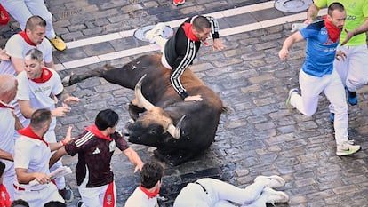 Las imágenes se repitieron en el tramo de Telefónica y en la bajada al callejón, donde se produjeron pequeños montones que obligaron a toros y cabestros a saltar por encima de los humanos, aunque alguno de estos se ganó algún que otro pisotón, de esos que tardan en olvidarse.