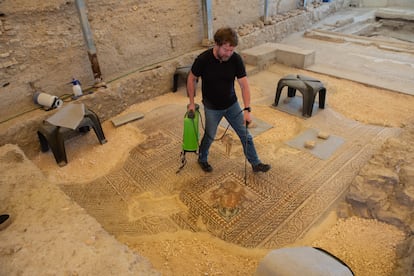 “Era también una forma de hacer ostentación de sus riquezas”, explica García-Dils. Y señala un mosaico esplendoroso justo al lado del recién descubierto, hallado en plena pandemia: “Aquí, por ejemplo, hay una escena de cacería, que aunque está hecha un cristo, se distingue muy bien lo que querían representar. Es una escena de caza de un gamo. Es muy interesante porque te da mucha información. ¿Qué te cuenta de la vida diaria con un gamo aquí? El gamo no una especie ibérica, sino que la introducen los romanos solo para cazarla. Entonces eso es claramente para decir, oye, que yo tengo gamos”, explica divertido el arqueólogo.