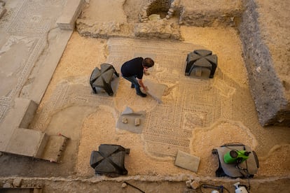 EL PAÍS ha entrado con García-Dils en una de las últimas excavaciones —tras los superlativos hallazgos de principios del siglo XXI en el centro de Écija— al otro lado de la ciudad, donde se han localizado dos formidables mansiones pertenecientes a los Fabio Poliones. “Las clases ricas y la aristocracia llega un momento en el que ya no quieren vivir en el foro. Como sucede ahora, se trasladan a las afueras”, narra el arqueólogo. El último descubrimiento ha sido un mosaico de más de 27 metros cuadrados, cuya calidad y conservación desafían las expectativas de los propios arqueólogos. Excavado este verano, ofrece una ventana única a las costumbres y la riqueza de las aristocracias romanas provinciales. Lo más interesante para el equipo científico es que, “por los nombres de quienes vivían aquí, sabemos que son gente local”. “Los Fabios Poliones son familias turdetanas [pueblo hispánico prerromano]. Aristocracias locales que colaboran con Roma y, por lo tanto, llegan a tener el estatus de ciudadanos romanos”.