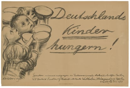 Entre ellos, sobresalen los dibujos de la artista Käthe Kollwitz, que, en la estela de Goya, representó los estragos del hambre sobre la población alemana durante y después de la guerra, incidiendo en el grupo más vulnerable: los niños. Obras como la dramática litografía ¡Pan!, en la que unos críos piden desesperados a su madre abatida tan elemental comida, y especialmente el cartel ¡Los niños alemanes se mueren de hambre! (1923), protagonizado por unos menores hambrientos que sostienen unos cuencos vacíos, volvían a denunciar un método de exterminio silencioso, menos ostentoso que los tanques o los submarinos que se estrenaron en la Gran Guerra, pero no por ello menos mortífero.