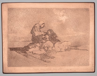 El contenido insuficiente de ese recipiente sirve en la estampa como respuesta elocuente a la pregunta retórica. Situada en el centro de la imagen, la taza representa un poderoso símbolo de la hambruna que asoló España durante la Guerra de la Independencia, especialmente entre 1811 y 1812. En torno a ella giran con expresión de abatimiento varias mujeres y el cadáver de un niño para el que la ayuda llega demasiado tarde. El coyuntural auxilio tampoco reconforta a los que sobreviven, pues saben que aquello que los mantiene con vida puede convertirse también en su veneno. Como recuerda otra estampa de la serie, Gracias a la almorta, esta leguminosa se convirtió durante la contienda en el único sustento de muchos, pero también en un cruel modo de prolongar su sufrimiento. Frente a las insuficientes cosechas de trigo, que a menudo eran requisadas por el ejército francés, esta legumbre se convirtió, en forma de gachas, en el único ingrediente de la dieta de miles de personas. Sin embargo, el consumo excesivo de la almorta acarreó graves consecuencias, como el latirismo, una intoxicación crónica que provocaba parálisis espástica y graves problemas de crecimiento en los niños.