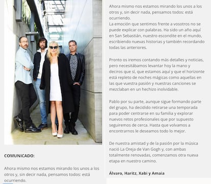 Además de guitarrista, Benegas es el principal compositor junto al teclista, Xabi San Martín. Se trata de un giro de guion inesperado de una historia que tuvo su capítulo más polémico hace 12 meses, cuando los cuatro miembros masculinos se desvinculaban de 17 años junto a Leire Martínez con un texto de 11 líneas. No es nada frecuente que uno de los líderes se baje del carro, pero solo a medias. Fuentes próximas al grupo apuntan a este periódico que no se trata de una incompatibilidad emocional entre el guitarrista y la cantante. “Pablo lleva 30 años con el grupo, está cansado y de momento ha decidido no participar en esta aventura”, señalan. En el comunicado oficial del grupo, firmado como “Álvaro, Haritz, Xabi y Amaia”, se dice sobre Benegas: “Pablo, por su parte, aunque sigue formando parte del grupo, ha decidido retirarse una temporada para poder centrarse en su familia y explorar nuevos retos profesionales que por supuesto seguiremos de cerca. Hasta que volvamos a encontrarnos le deseamos todo lo mejor”.