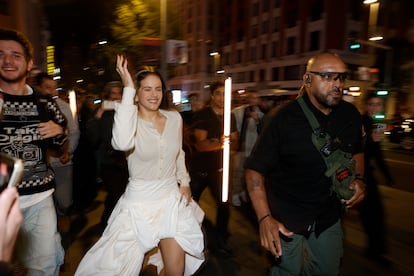 Gracias a su directo en TikTok pudimos ver cómo maquillaban y vestían a la artista, con la música de The Strokes sonando de fondo. “Llevo tres años preparando este día y por fin ha llegado”, dijo mientras montaba en el ascensor para coger un coche camino de Callao. “Poneos el cinturón que nos vamos de rally”, anunció la artista al volante de un coche ocupado por sus asistentes. Llevaba colgado del espejo retrovisor un rosario. Para amenizar el trayecto, sonó música clásica, Camarón (Vamos pa casa) o Guitarricadelafuente. Rosalía bajó la ventanilla en un semáforo y habló con otro conductor; unas chicas se acercaron, la reconocieron y se hicieron fotos con ella. El trayecto se empezó a complicar cuando llegaron a una atestada Gran Vía. Allí fue donde la cantante tuvo que bajar del coche y seguir corriendo hasta un hotel.