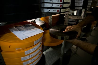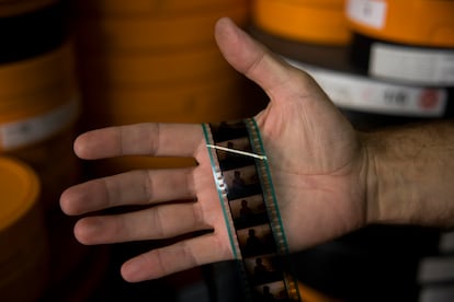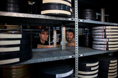 Hoy el formato en 35 milímetros, salvo para eventos excepcionales, no se usa y los rollos hibernan a la sombra —cuanto más arriba de las estanterías, más viejos los títulos— a la espera de ser reciclados como material industrial. En Baños Films, que en pocas semanas liberará muchos metros cuadrados, innecesarios tras la digitalización del cine comercial, también se guardan infinidad de viejos carteles promocionales de películas recordadas u olvidadas. Ahora, comenta Pablo, el más nostálgico de los hermanos, “hay 15 estrenos a la semana”; todo es más ligero y vuela. Antes, cada novedad en la cartelera era un acontecimiento que absorbía las energías de la familia durante mucho tiempo. Las películas había que cargarlas y descargarlas; traerlas de Madrid, donde se hacían las copias; llevarlas hasta el último rincón, turnarlas entre cines, con compromisos de fecha que era una proeza cumplir. “Y las movíamos a puro músculo, no nos hacía falta gimnasio”, bromea Milo.