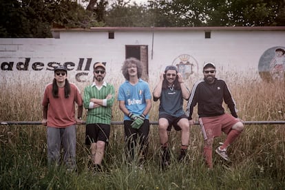 En el segundo 28 aparecerá la voz de Alberto García (38 años, La Felguera). “Ese desafine intencionado es una sensación transversal en muchos momentos del disco. Buscamos el sonido de banda popular que no es del todo limpio. De los músicos que llegan a una fiesta de prao y tocan con lo que tienen”, explica en conversación telefónica. “El disco se llama Barro por todo lo que abarca ese concepto. Por el momento fangoso que vivimos como humanos, porque vamos cumpliendo años y la vida se va convirtiendo en un lodazal. Pero también como lugar para el juego de nuestros perros ―los canes de los cinco miembros de la banda aparecen el portada del disco―, como materia desde la que se puede crear y, sobre todo, como una analogía con el fútbol de barro. En la música, aunque no lo parezca, hay más barro que otra cosa”, explica el líder de una banda cuyos cinco integrantes complementan la música con otros trabajos. Cartero, profesor de guitarra o pintor. “La profesionalidad va por temporadas”, dice Alberto, historiador y musicólogo que, cuando no está de gira, se dedica al diseño gráfico.