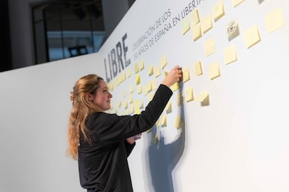 Esa misma preocupación la traslada Carmina Gustrán, comisionada de España en Libertad 50 años —impulsada por el Ministerio de Política Territorial y Memoria Democrática—. “Desde la academia”, dice, “aún existe desconocimiento, y los jóvenes a veces repiten ideas equivocadas sobre el franquismo, como decir que con Franco se vivía mejor”. Gustrán explica que para defender la democracia son importantes tres pilares: “Conocer el pasado, celebrar lo que tenemos y crear espacios para hacerlo. La instalación Libre —que abrió el sábado y estará hasta las nueve de la noche de este domingo— funciona precisamente como esto último. Sin embargo, “hace falta mucho trabajo en las tres”, apunta.