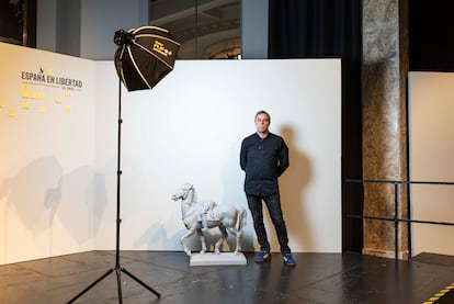 A los pies de Félix Villalba hay 25.000 caballos. Camina alrededor de ellos antes de decidirse por uno. “¿Le han explicado cómo funciona?”, le preguntaron al entrar a la Sala de Columnas. “Puede hacer un dibujo o escribir lo que quiera sobre lo que más valora de la vida en democracia e intercambiarlo por una de las figuras. Una obra de arte por otra”. El sevillano se detiene frente al muro donde varios han puesto sus pensamientos y escribe en la nota adhesiva, tan pequeña que cabe en la palma de su mano, al igual que los caballos. Finalmente, coge uno de ellos sin jinete. Sin Franco. La miniatura —que representa la estatua ecuestre del dictador muerto hace 50 años— lleva grabada en la base: “España en Libertad”. Y forma parte de Libre, una instalación que conmemora medio siglo del país en democracia.
