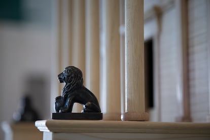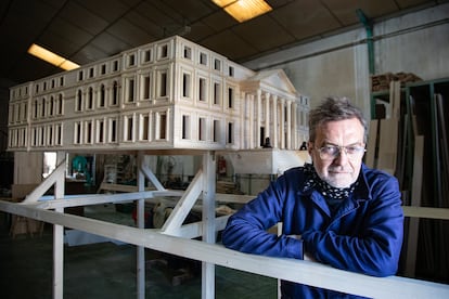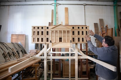 El martes pasado, Bachiller daba los últimos retoques a la maqueta, de metro y medio de ancho, construida en madera de pino según los planos originales del edificio inaugurado en 1850 por la reina Isabel II. Acababan de llegar las réplicas en miniatura de Daoiz y Velarde, los icónicos leones que flanquean la escalinata de la fachada principal del Congreso. “Es lo más raro que he hecho nunca”, bromeaba. Le ayudaba el creador teatral Roger Bernat, ideólogo de la singular procesión bautizada como Desplazamiento del Congreso, así como el actor Juan Navarro, que ejercerá de maestro de ceremonias el domingo. “Arrancar de sus cimientos ese monumento, que no deja de ser el símbolo de nuestra estabilidad, para llevarlo a lugares que habitualmente no visita y que probablemente desconoce, es una manera de precarizarlo pero al mismo tiempo de dotarlo de significados que quizá ha ido perdiendo con el tiempo”, explica Bernat.