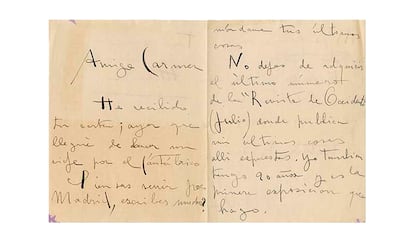 Y la que la artista le manda a Jean Cassou, director del Museo de Arte Moderno de París y activo defensor del bando republicano, el 10 de febrero de 1937, un día después de desembarcar en Buenos Aires, huyendo de la Guerra Civil. Escribe fragmentos durísimos que describían el conflicto: “Es muy frecuente encontrar los cadáveres de los trabajadores por las carreteras, o cruzados por los caminos, fracturados, macerados”; “los que no reciben el golpe de gracia en los fusilamientos en masa, se levantan entre quince cadáveres calientes pues los tiradores no son siempre hábiles”; “terror, pánico, horror, espanto, odio, desesperación. Mi estancia allí era cada vez más peligrosa (...) Gentes que llegaban se extrañaban que no me hubieran fusilado”; “no olvide Cassou de decir a todos los trabajadores que en Galicia se fusila y asesina por pensar”.