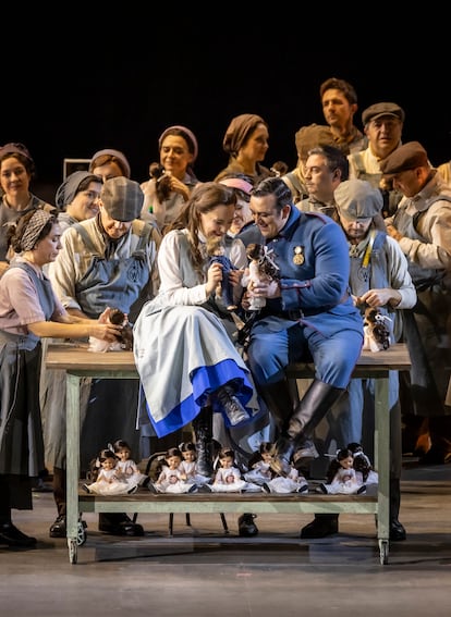 Para esta nueva producción de Luisa Miller, que Les Arts estrena en coproducción con el Maggio Musicale Fiorentino, la directora de escena Valentina Carrasco traslada la acción a una fábrica de muñecas de comienzos del siglo XX. La propuesta funciona con notable eficacia hasta el tercer acto. La escenografía de Carles Berga unifica ese entorno burgués e industrial situando al conde de Walter en el piso superior como director de la fábrica y a Miller en el inferior como simple operario. A ello se suma la iluminación de Antonio Castro y el vestuario de Luciana Gutman, que incide en el modelo físico que representan las muñecas dentro de una sociedad opresiva dominada por la autoridad paterna.