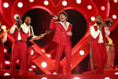 En la política gala, las actuaciones también fueron poderosas. Los primeros en subir al escenario fueron Rosé y Bruno Mars, cargados de guitarras y rollazo, con ese tema viral del año pasado que fue Apt., y con el que pusieron en pie a medio Crypto.com Arena. Él volvería más tarde con su I Just Might. Después, con Sabrina Carpenter, que —tras ser la reina absoluta de la alfombra roja— cantó Manchild en una gran puesta en escena entre cintas de aeropuerto y maletas.