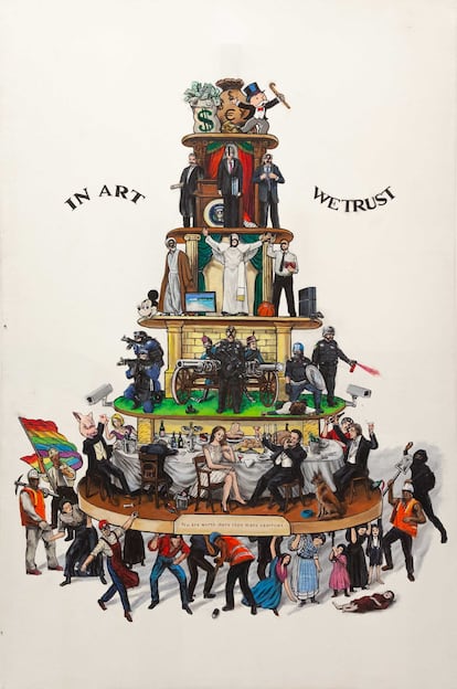 Entre las obras destaca el grafiti de Ozmo Tú vales más que muchos gorriones, una pieza que condensa crítica y narración en una torre de seis peldaños. En la base se encuentran obreros y manifestantes, seguidos por la clase ociosa degustando banquetes; más arriba, militares; después, religiosos; encima, políticos; y en la cima, el dinero. La composición incluye la frase: “In art we trust” (En el arte confiamos). Aunque no lo parezca, “todas estas obras nos obligan a reflexionar sobre el mundo de una manera positiva”, señala Cattaneo.