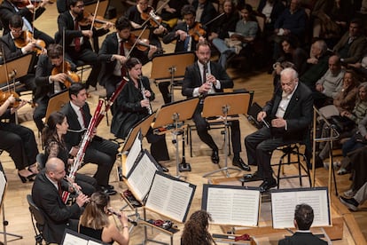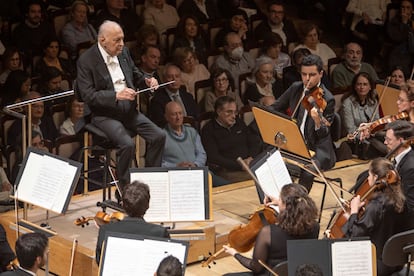 Una velada —el sábado 14 de febrero— y una matiné, el domingo 15, al frente de la West-Eastern Divan Orchestra, el conjunto creado en 1999 por Daniel Barenboim que reúne a jóvenes músicos israelíes, palestinos y de otros países árabes. El legendario director y pianista argentino, que ha reducido notablemente sus actuaciones desde que hizo público que padece párkinson, asistió también a ambos conciertos, sentado en el patio de butacas del Auditorio Nacional de Música junto a la reina Sofía.