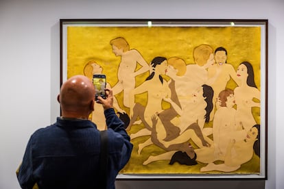 “Esa desnudez no es una provocación ni una reducción al erotismo”, explican desde la galería, “sino la afirmación de cuerpos libres, en movimiento perpetuo, resilientes y combativos”. En sus explícitas orgías entre las representantes, el público de Arco ha encontrado un punto de encuentro, curiosidad y morbo —por qué no decirlo—. Khademi, artista, performer y activista, exiliada de su país en Francia desde 2021, ha conseguido con esa atención transmitir su mensaje. El pan, el trabajo y la libertad son derechos fundamentales negados a las mujeres que siguen en Afganistán; a cambio, el gobierno talibán les condena a la pobreza.