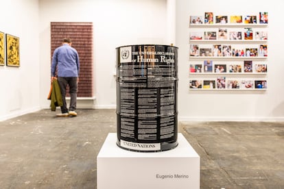Así comienza una nueva edición de esta feria en la que una vez más, la reivindicación más política queda encapsulada en las denominadas piezas polémicas, una etiqueta que ya es una tradición en Arco. Entre las 211 galerías, de 30 países, que participan este año, hay que dirigir los pasos siempre hacia un puñado para saciar esta necesidad. El recorrido suele comenzar en ADN, donde Eugenio Merino hace de las suyas; en esta ocasión con Pétroleo, un bidón de este combustible fósil sobre el que ha estampado la Declaración Universal de los Derechos Humanos. “El petróleo es el motor de las guerras, lo que lo hace incompatible con la vida”, comenta el autor de White Washing, el lavavajillas en el que metió a la ultraderecha en la anterior edición, también responsable de encerrar a Franco en una nevera, creador de un ninot del rey y organizador de la capilla ardiente de Picasso. “Lo que manda es esta fuerza extractiva”, acompaña el responsable de la galería que señala otra obra del artista La puerta del fascismo, un picaporte con una esvástica nazi.