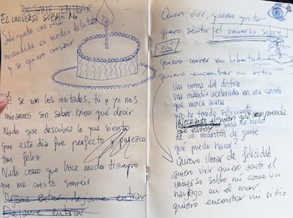 “Quiero vivir / Quiero gritar / Quiero sentir / El universo sobre mí / Quiero correr en libertad / Quiero encontrar mi sitio”. El estribillo de la que es probablemente la canción más popular del grupo Amaral, El universo sobre mí, publicada en el disco Pájaros en la cabeza (2009), encadena metáforas sobre la pérdida de la inocencia o la soledad en la que se encuentran tantas personas en las grandes ciudades. Sin embargo, ese tema se llamaba en un principio Déjame entrar. Esas dos palabras están tachadas al comienzo en la doble página del cuaderno en el que la escribió el dúo, formado por Eva Amaral y Juan Aguirre. Es una de las sorpresas para los visitantes de la pequeña exposición que acoge el Instituto Cervantes en Madrid, titulada Las mejores letras en español, de acceso gratuito y hasta el 21 de junio.