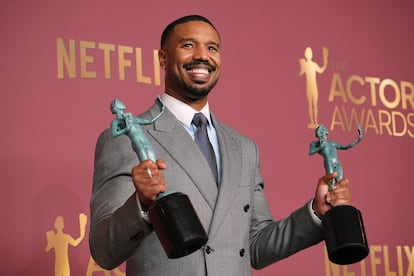 Michael B. Jordan posa con los premios a la actuación sobresaliente de un actor masculino en un papel principal y a la actuación sobresaliente de un elenco en una película por 'Los pecadores' durante la 32.ª edición anual de los Actor Awards, el 1 de marzo de 2026, en Los Ángeles. Jordan Strauss (Jordan Strauss/Invision/AP)