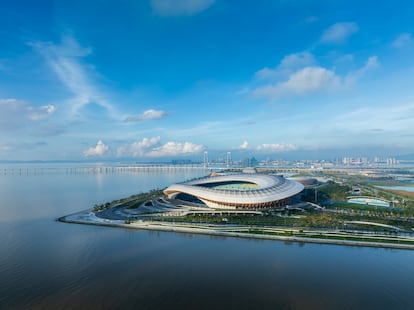 Vista aérea del Greater Bay Area Sports Center diseñado por Zaha Hadid Architects al sur de Guangzhou.Seilaojiong
