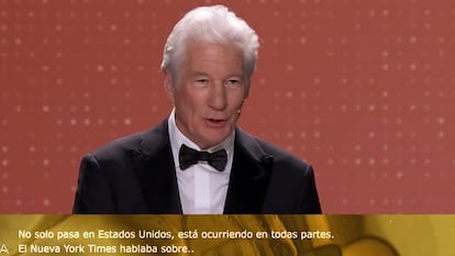La Academia ha confirmado a EL PAÍS que una persona ha estado traduciendo el discurso de Gere y que el actor no entregó un texto a la organización previamente. Gere avisó que iba a improvisar, informa Gregorio Belinchón.