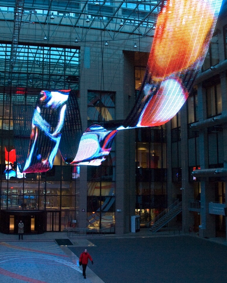 Las tres inmensas pantallas escultóricas entrelazadas recogían cada pulso de los paseantes a través de sensores situados en la barandilla para crear las imágenes proyectadas y una experiencia audiovisual única.